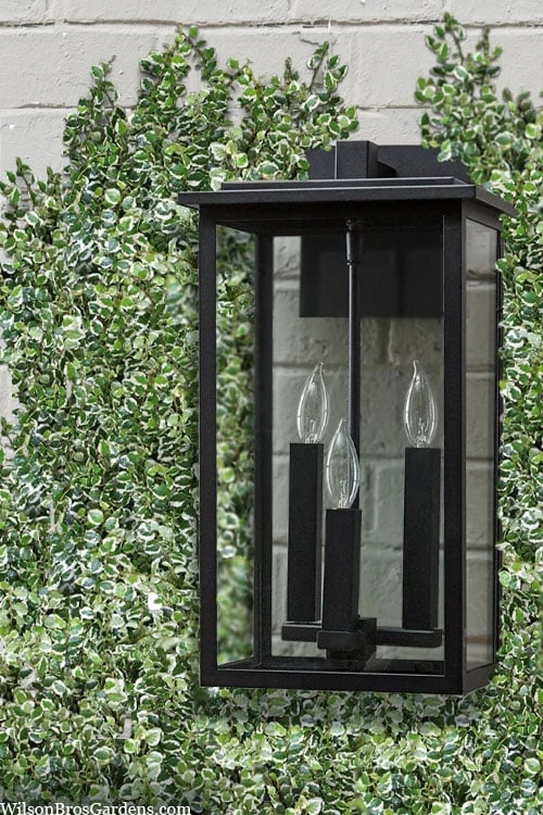 Creeping Fig can be used as a groundcover, but is most often used as an enthusiastic climber able to scramble up brick, stone, or stucco walls up to 3 to 4 stories tall. ‘Variegata’ is a creeping fig vine that coats surfaces with a tracery of fine stems that are densely covered with small, heart shaped, green leaves that are boldly edged in white. The leaves are about 1 inch long by about .75 of an inch wide. When growing up and against a wall the leaves form a mat that extends barely 1 inch from the surface to form a “live wall.”